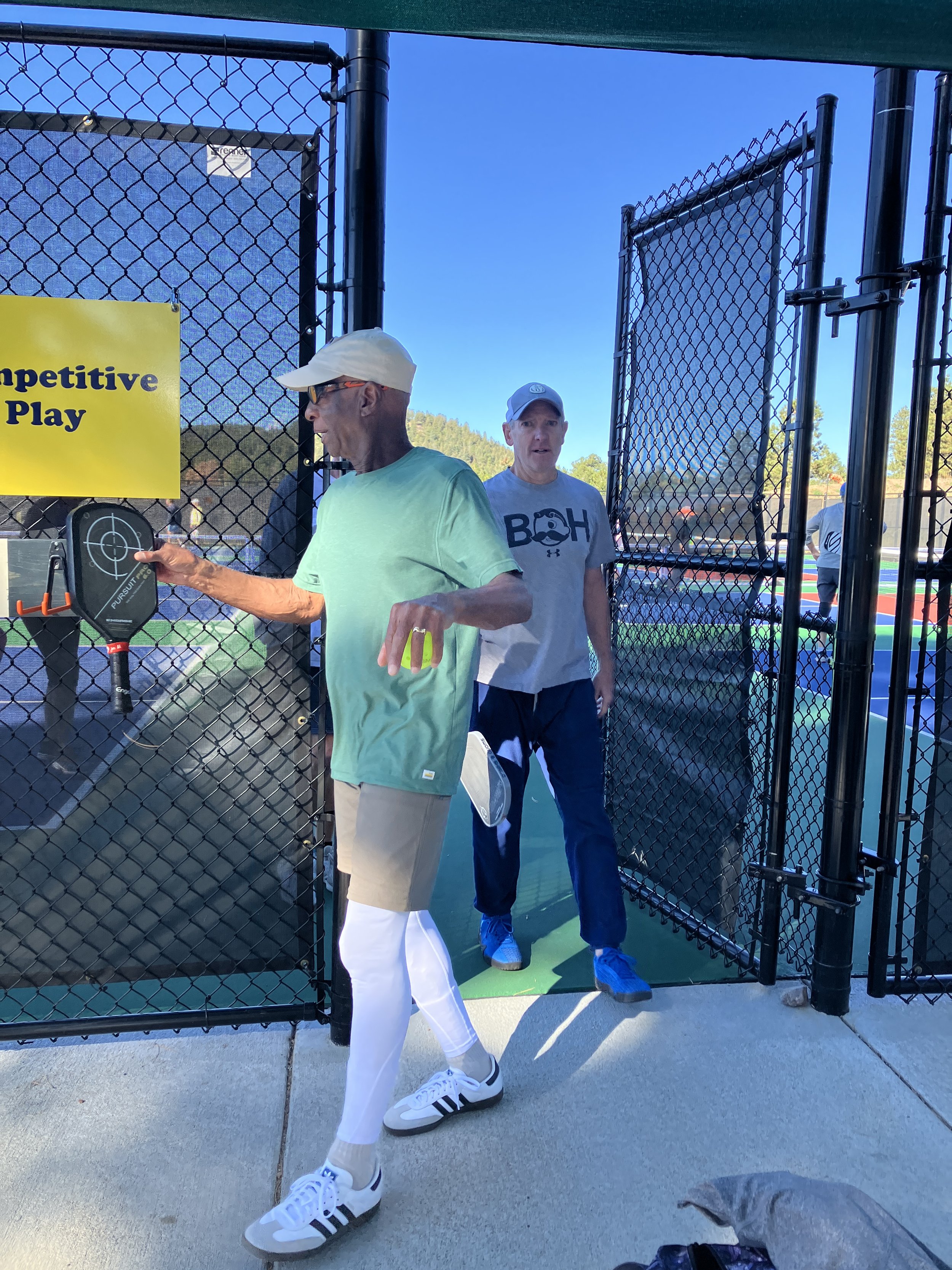 Doc Jim Mosby puts his paddle up for another game as T Robinson follows him off the Marshdale courts Thursday.