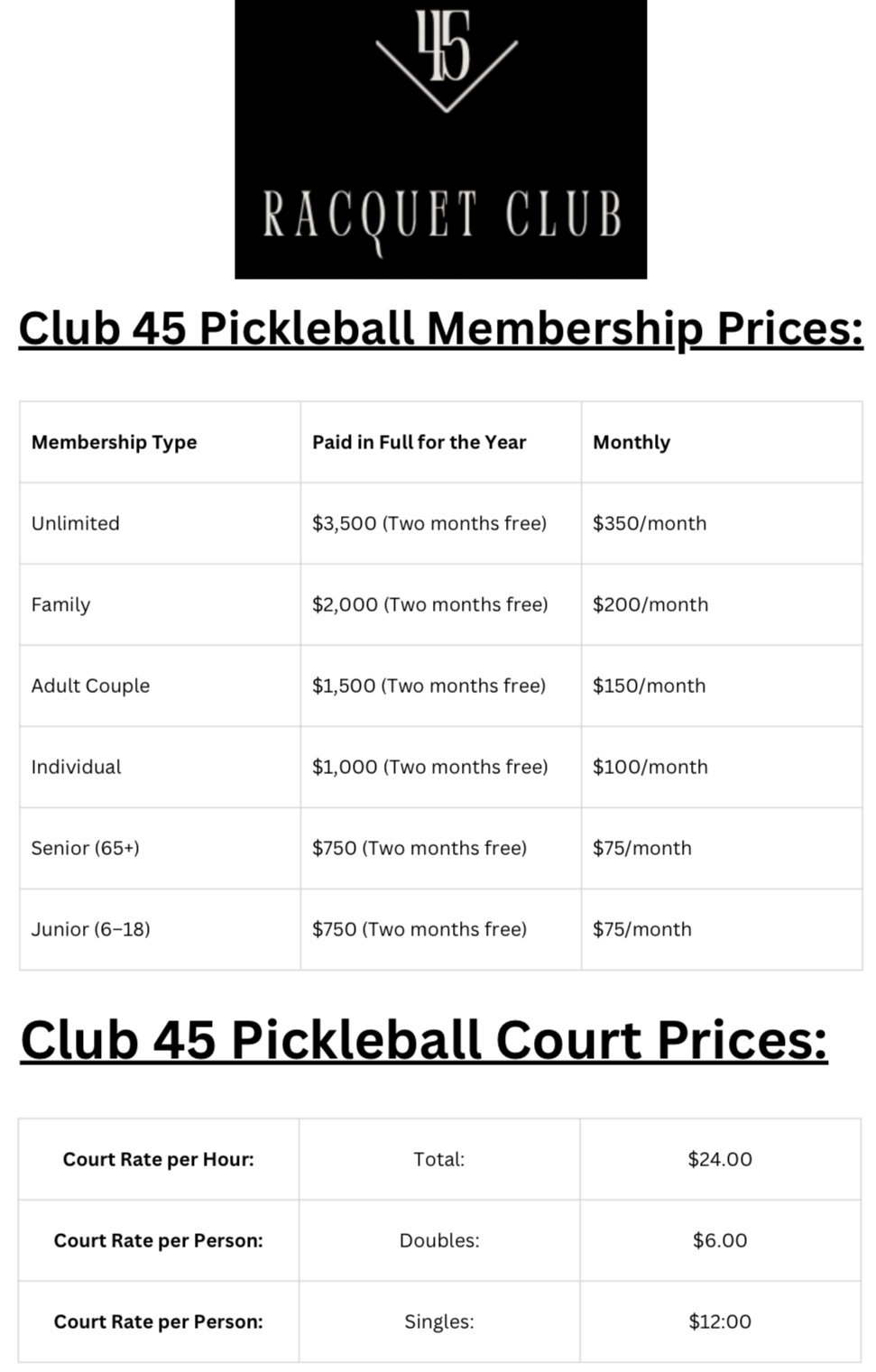 “From now until Nov. 30, all guest fees for EPC members will be waived. However, standard court reservation fees will still apply ($24 per four-person court per hour). Additionally, if you choose to join Club 45 before Nov. 30, you will receive a 10% discount on your membership, whether you opt for monthly payments or pay in full.