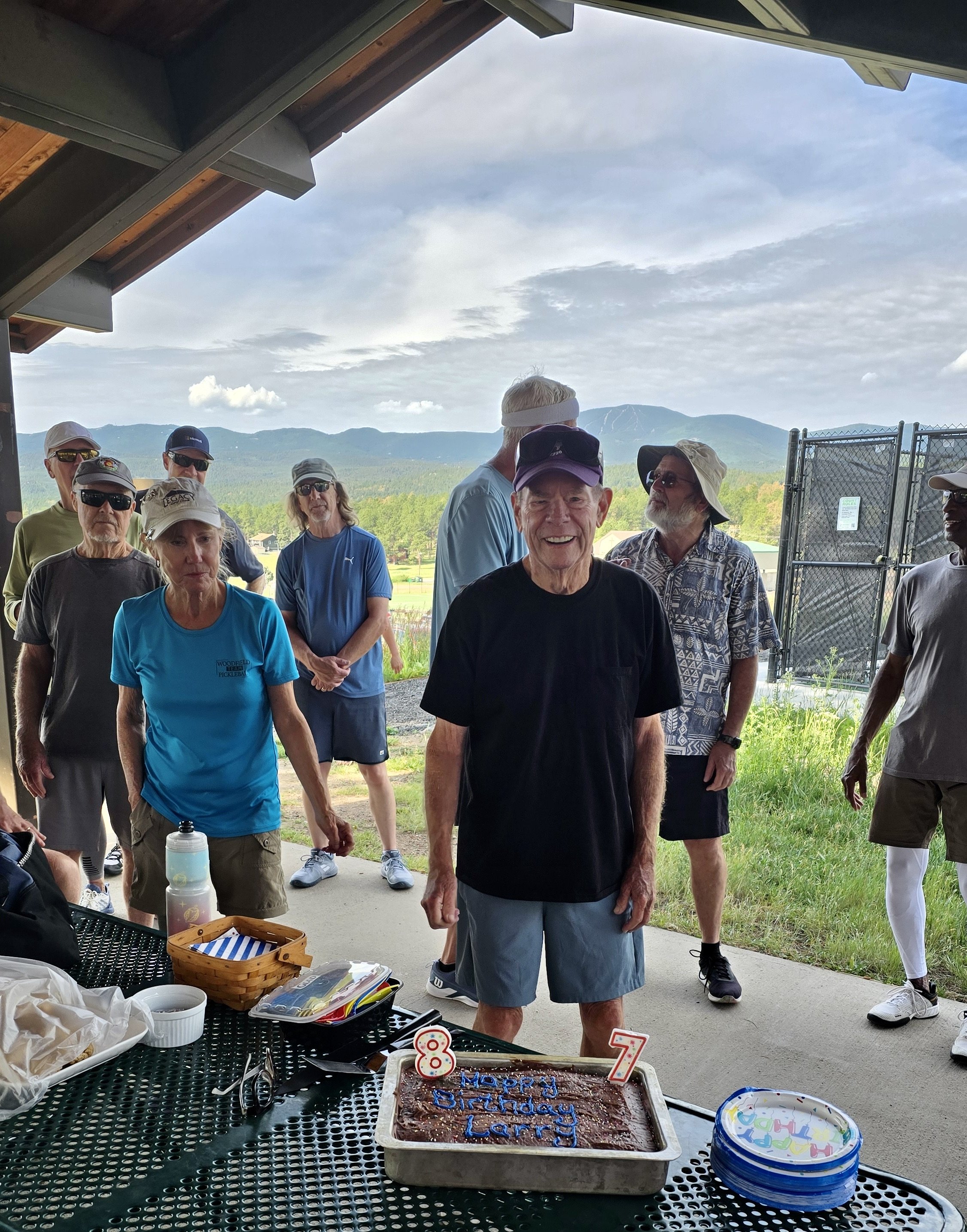 The large and rambunctious crowd that is Thursday morning Ladder at Marshdale honored one of its most steadfast members yesterday with a birthday celebration. Evergreen pickleball just wouldn’t be complete without Larry Anderson’s hugs for the ladies and his doggone frustrating lob serves.