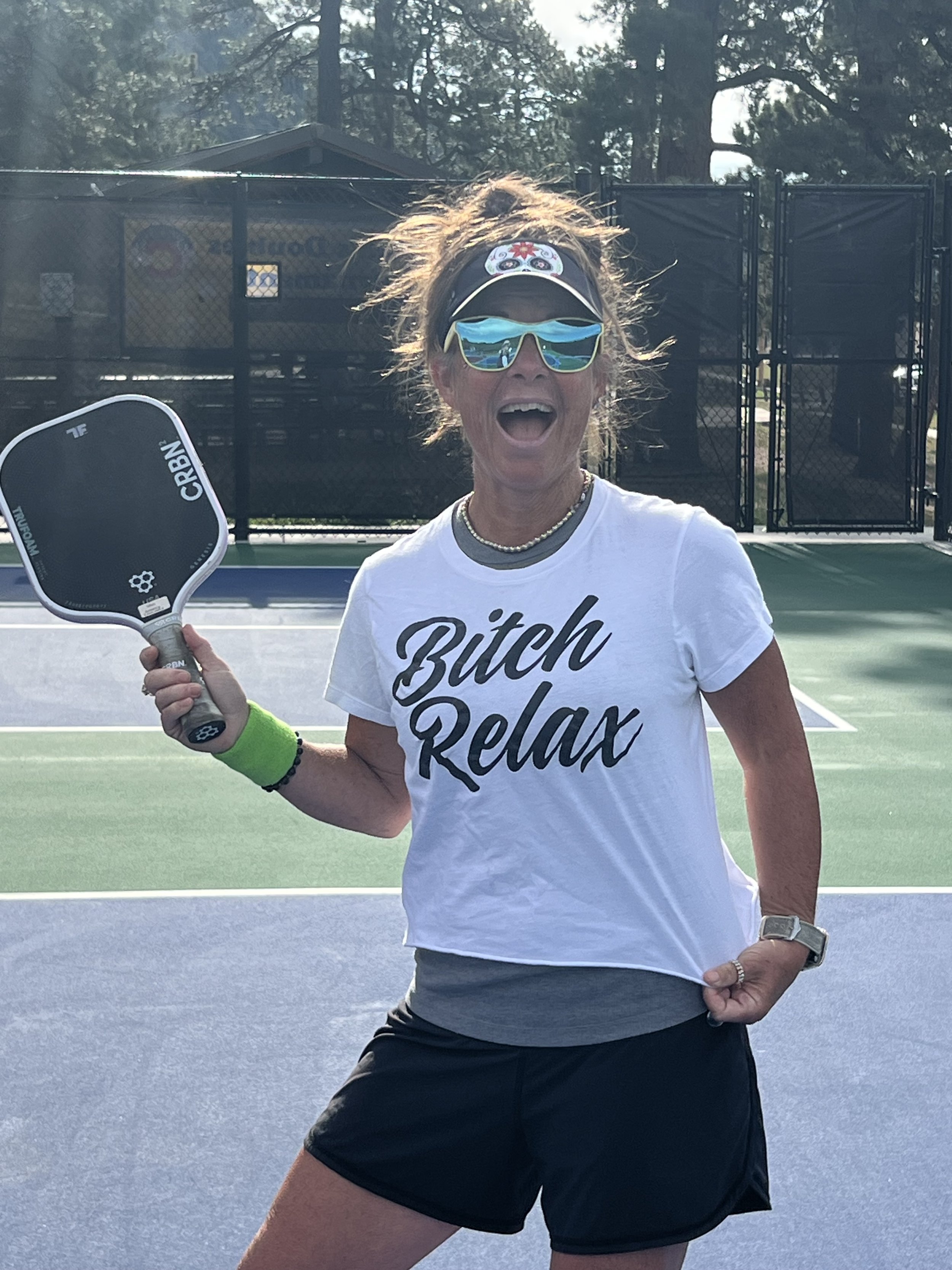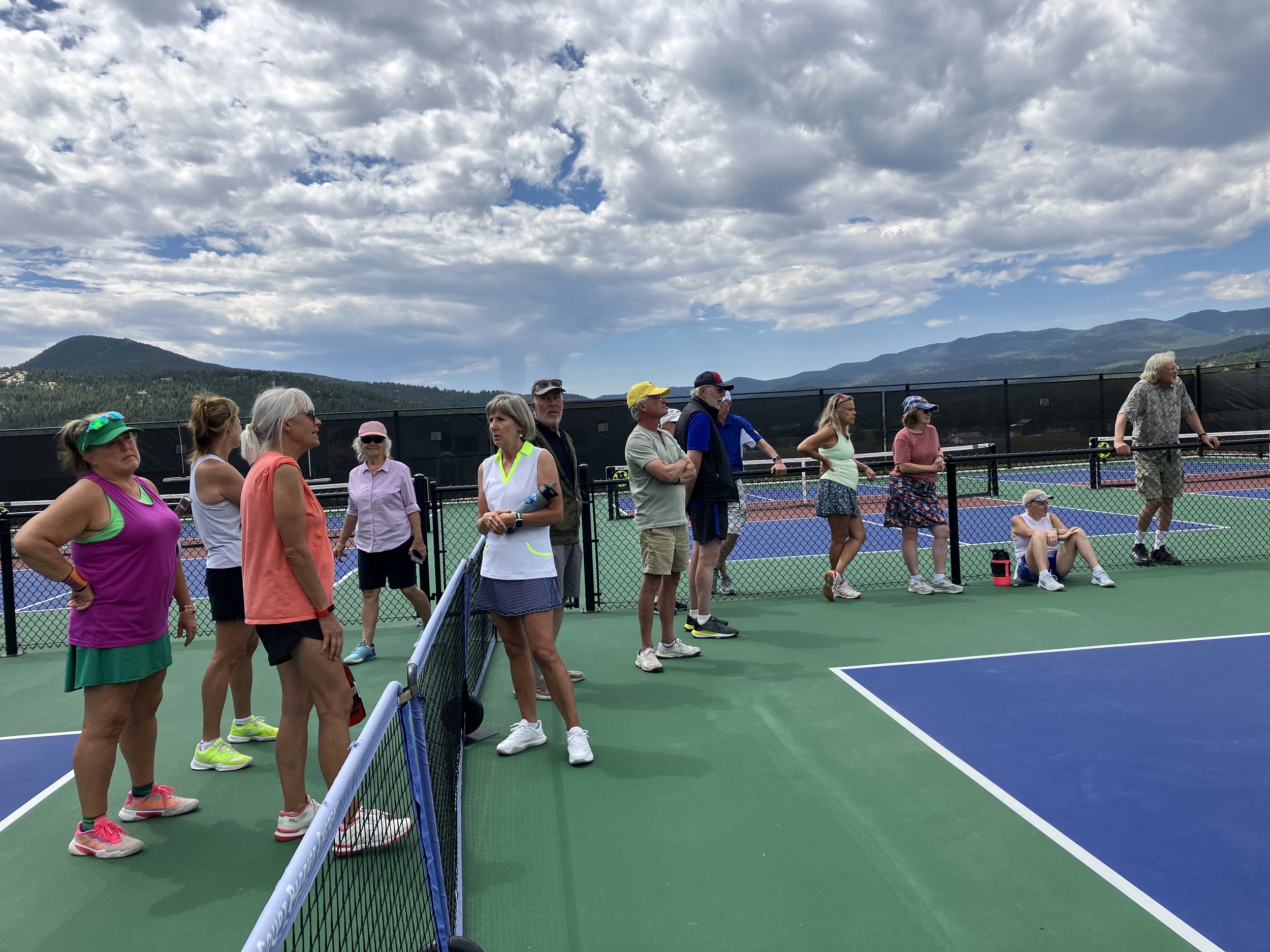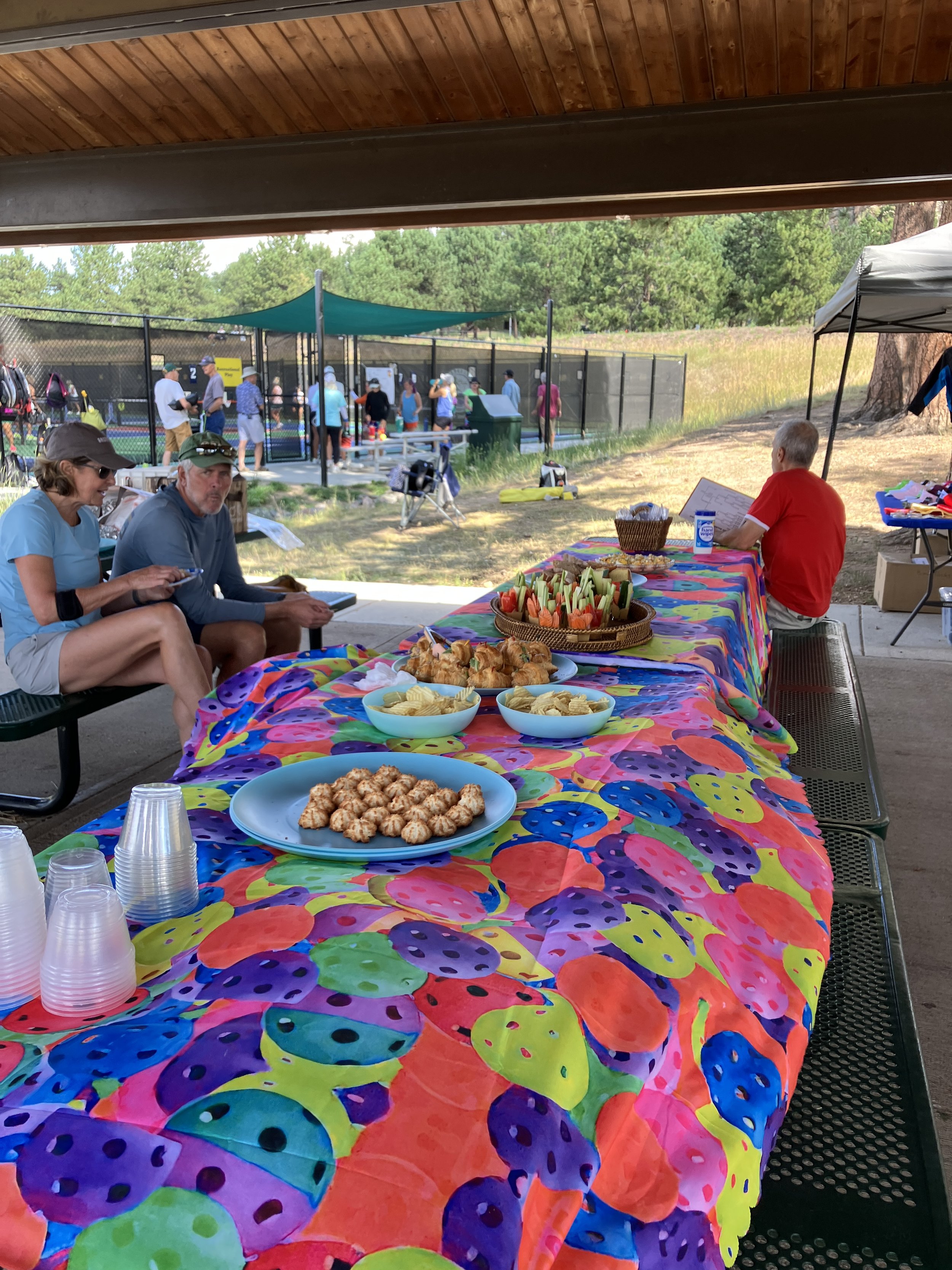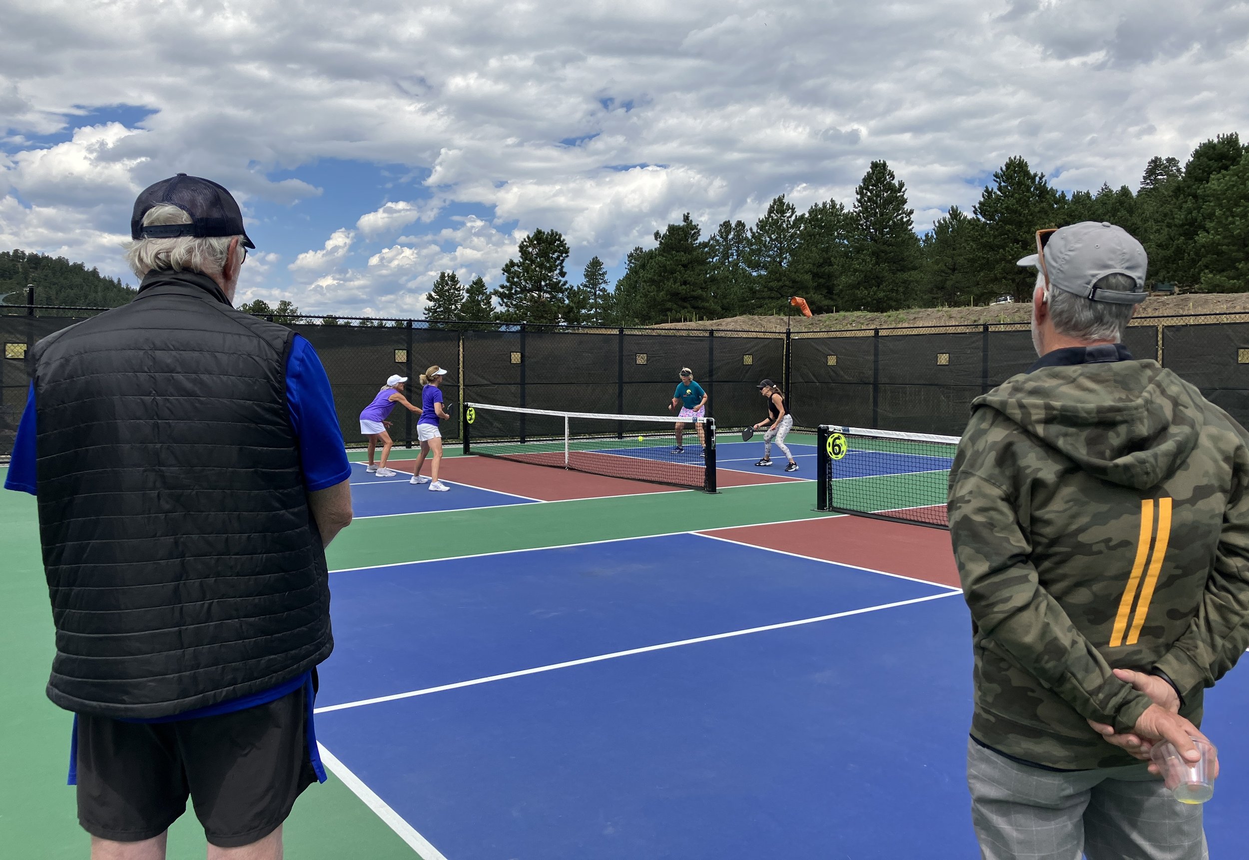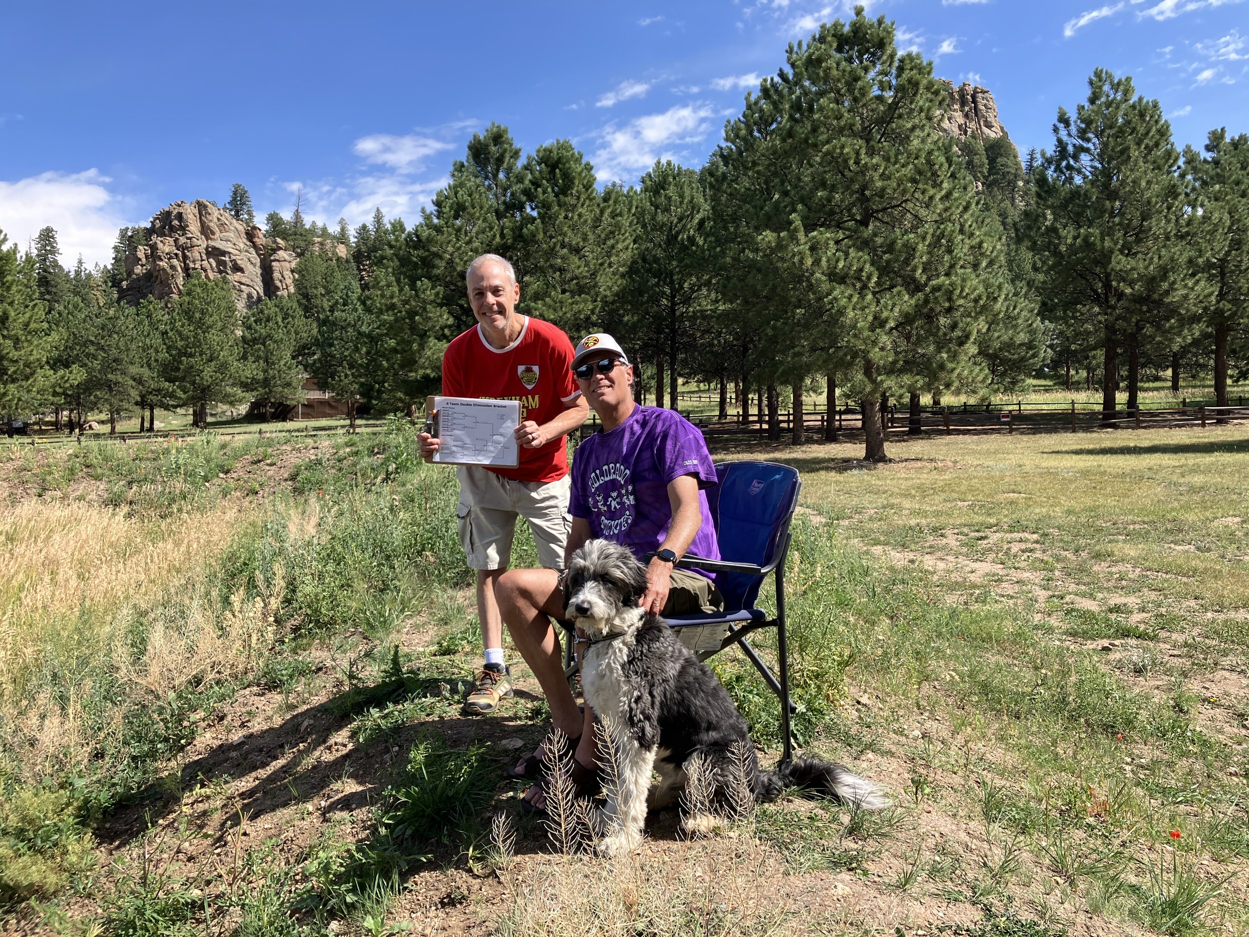 Group 1 scorekeeper Giuliano Hofling and Dan Goldstein, along with Aussie doodle Sukha, enjoyed the action from above the courts. Dan is winner Diane Goldstein super supportive husband.