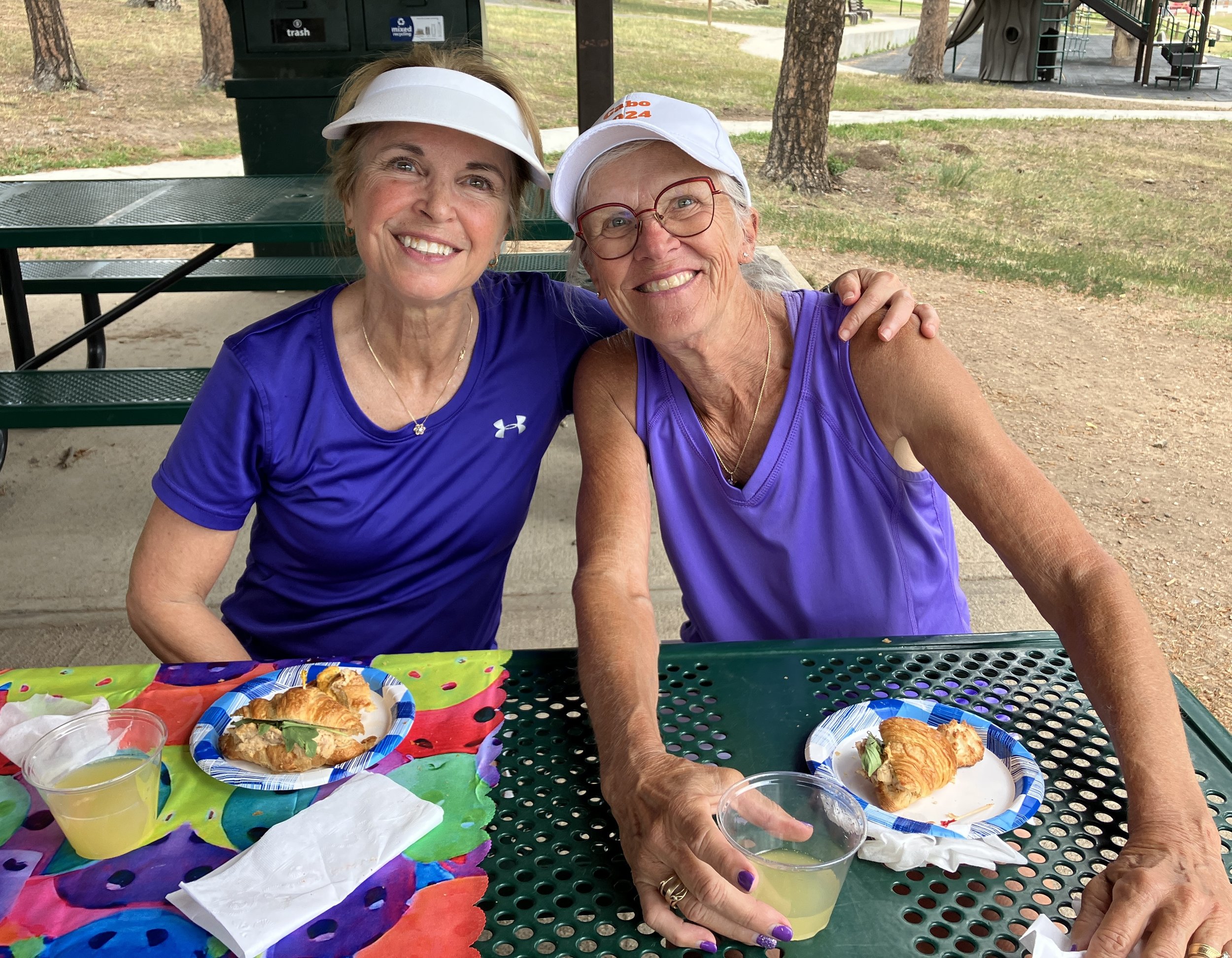 Nancy Hamilton, left, and Nancy Pudwill celebrate their second-place finish with mimosas and croissant sandwiches. You won’t find those treats at most tournaments.
