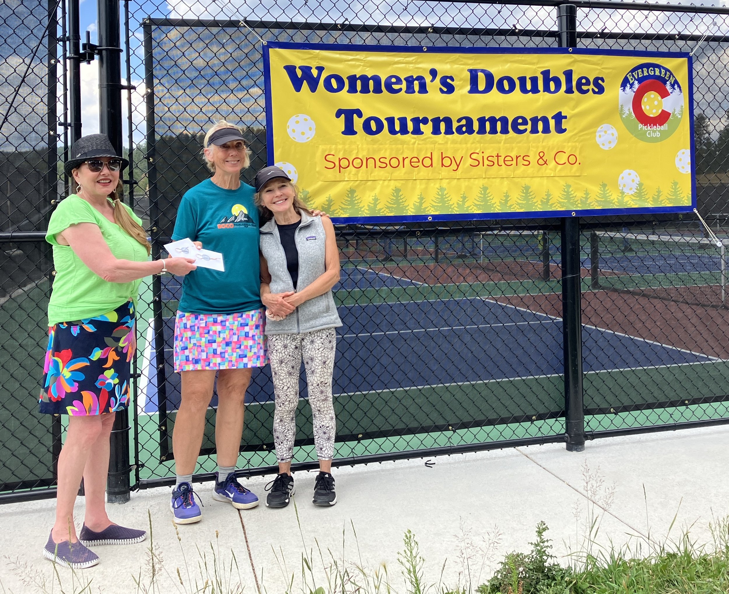 Gig Blitz, left, and Susan Dickenson are presented with cash prizes by Sisters & Company representative Kathy Kincannon, who is the EPC social director.