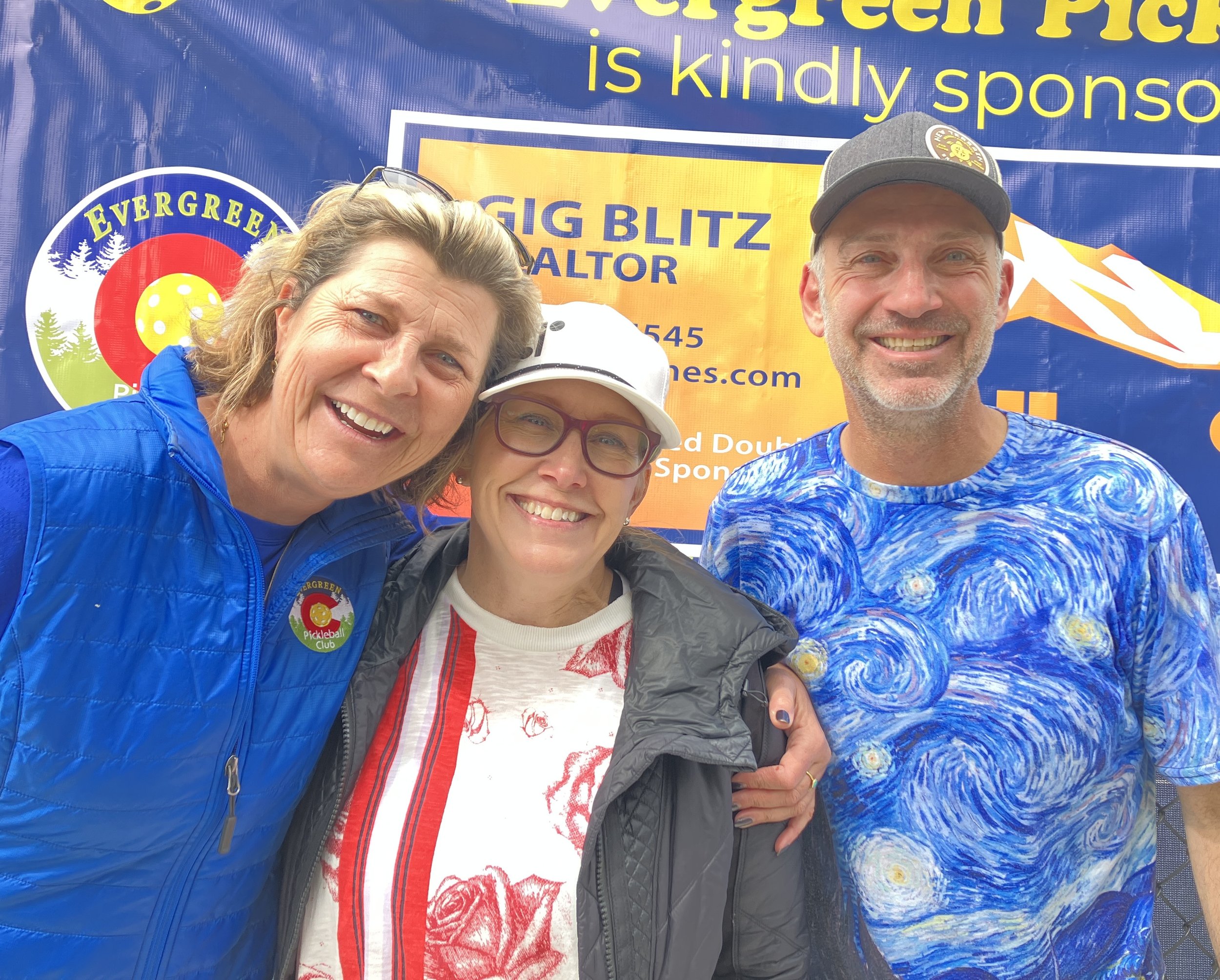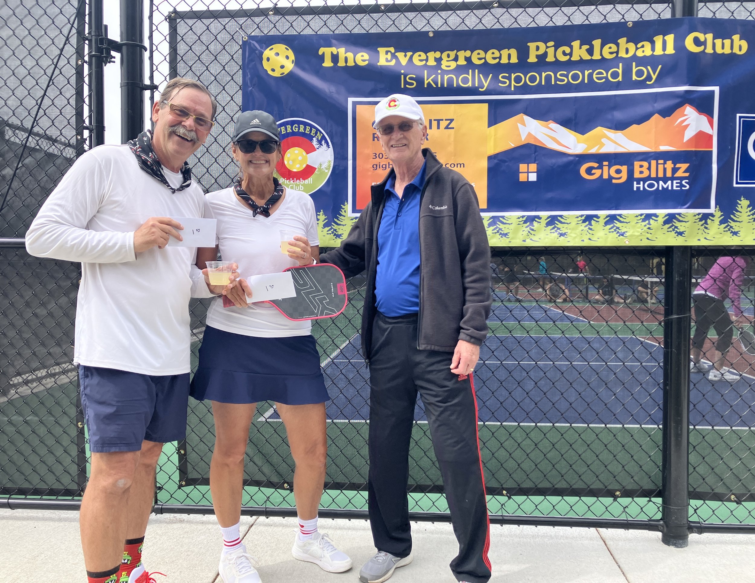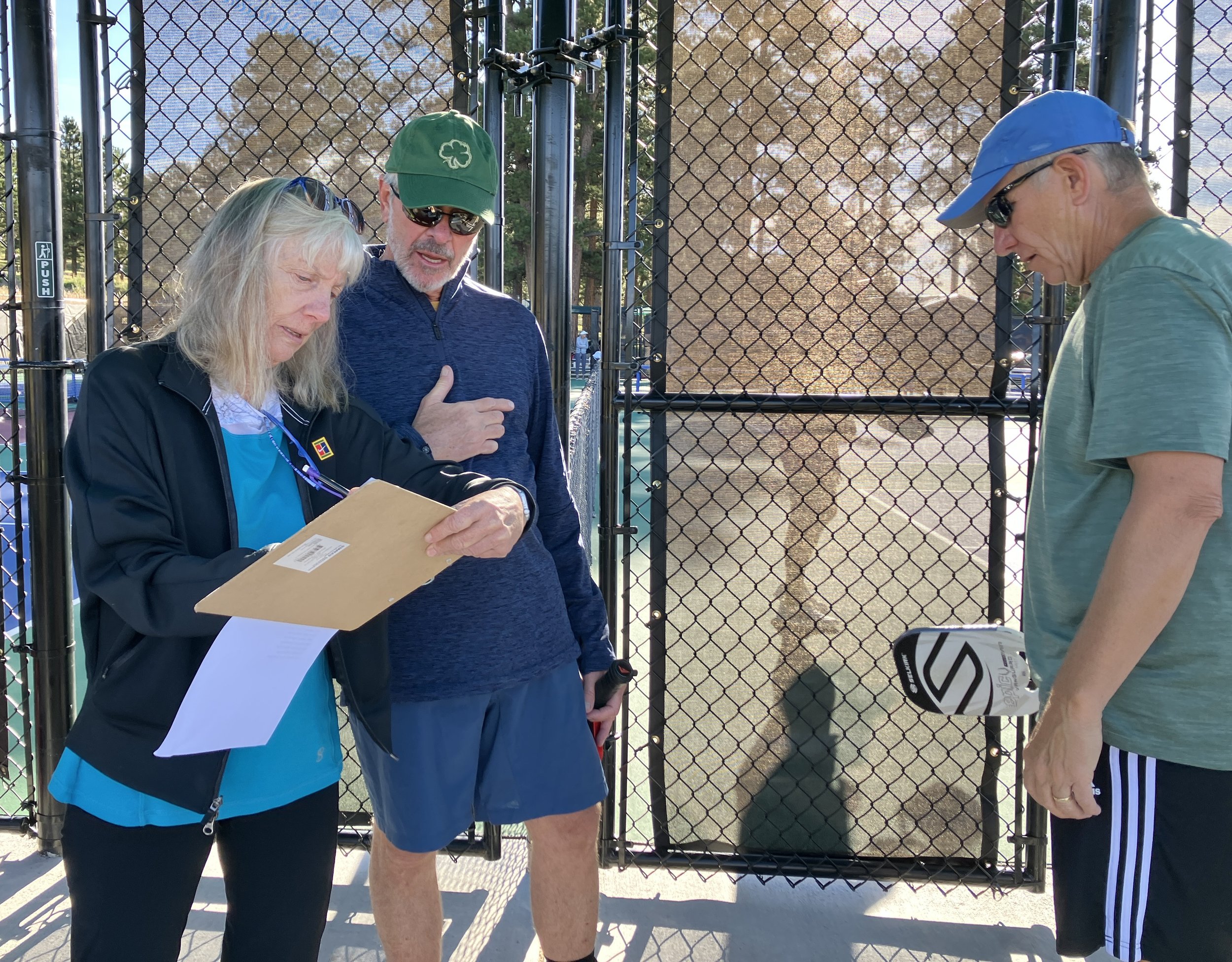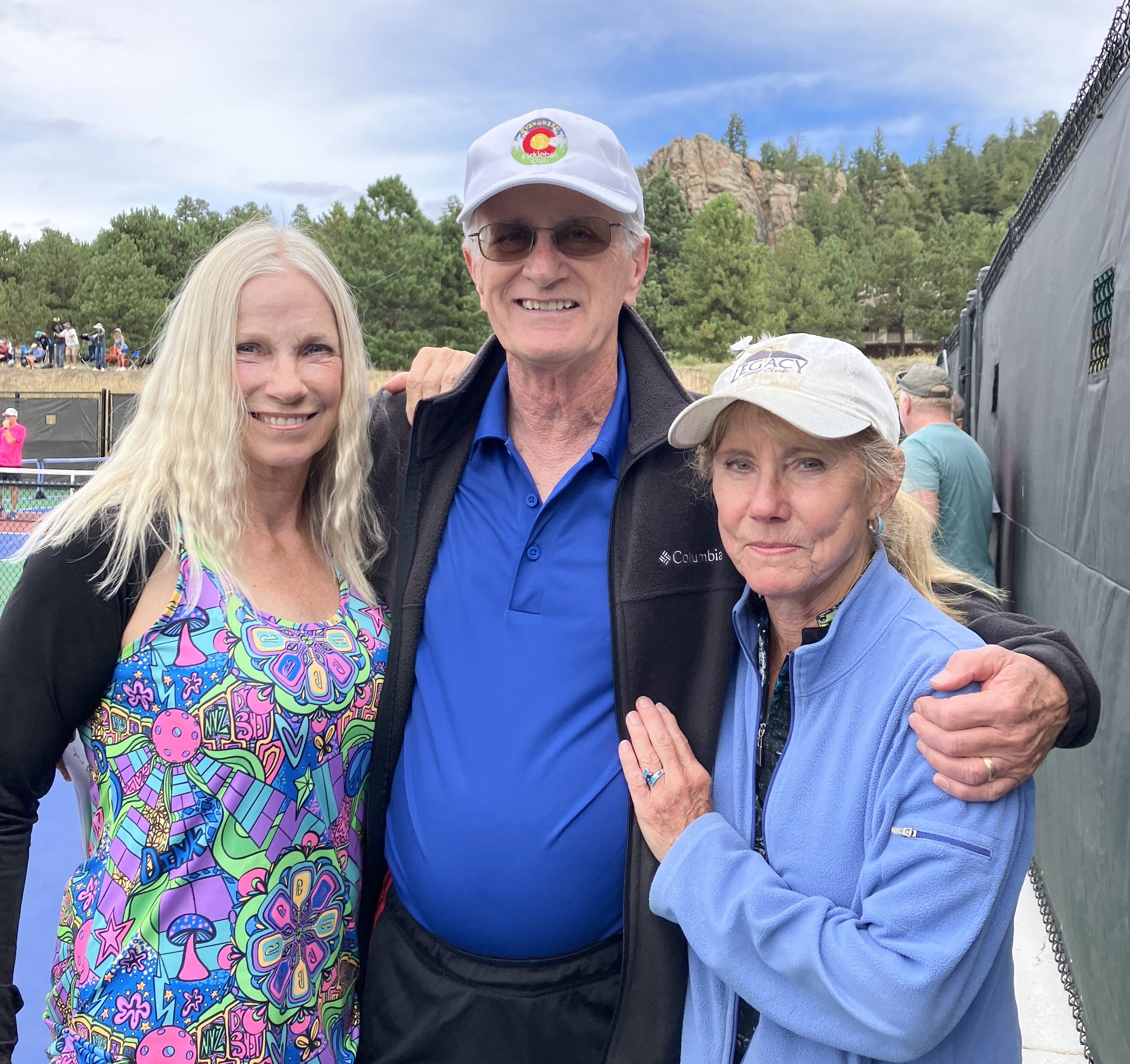 Linda Jacobsen, left, and Kathy Fasold appreciate all Mick Pearce has done for Evergreen Pickleball Club. I think his nonverbal replay was “Right back at ya.”