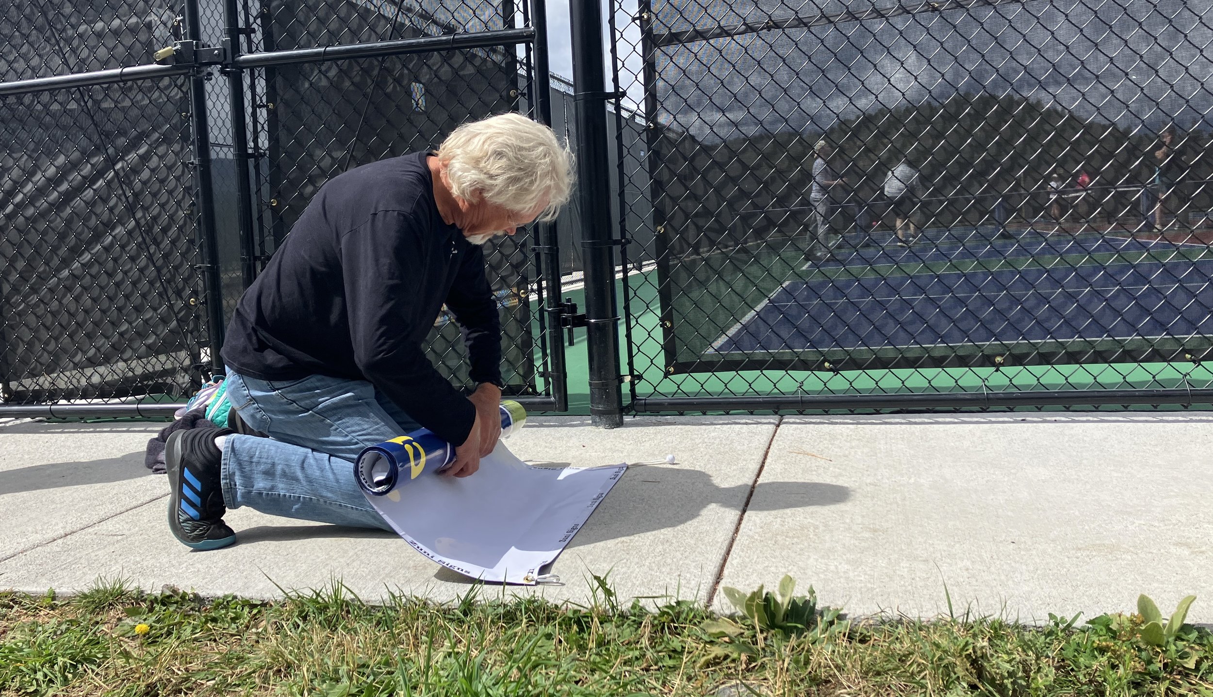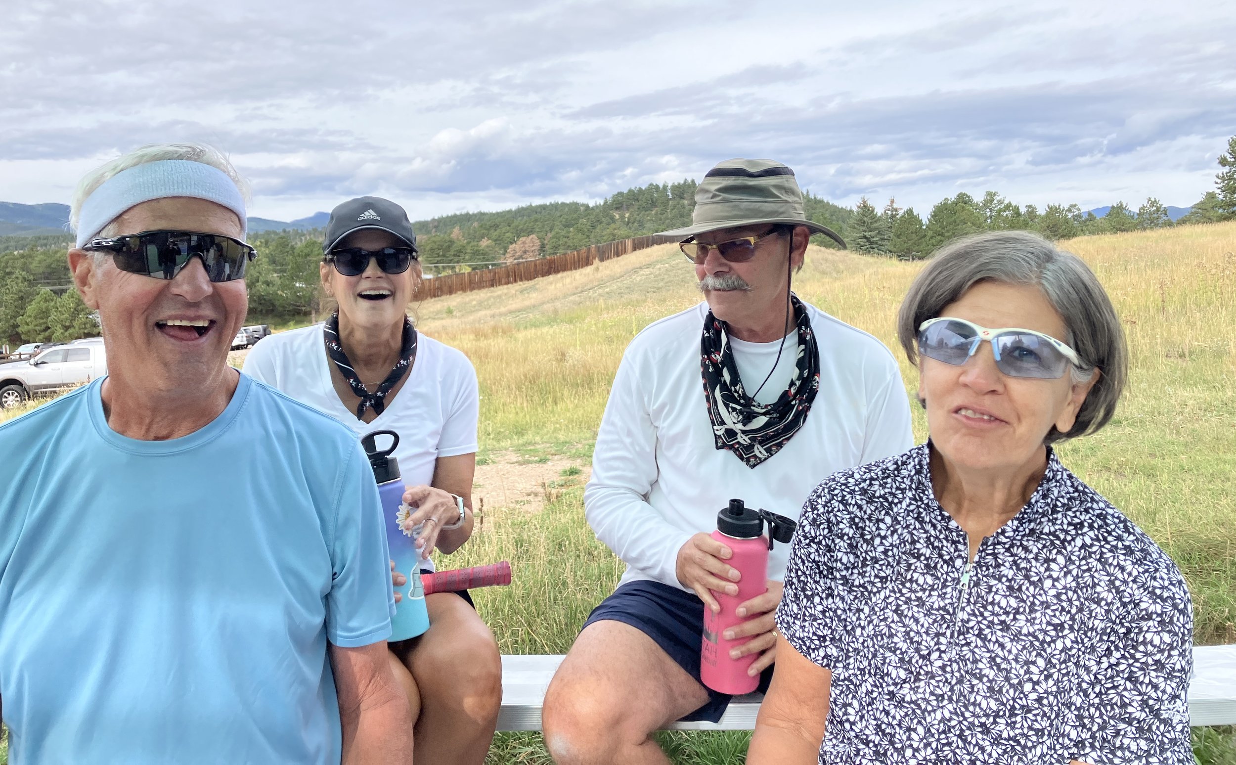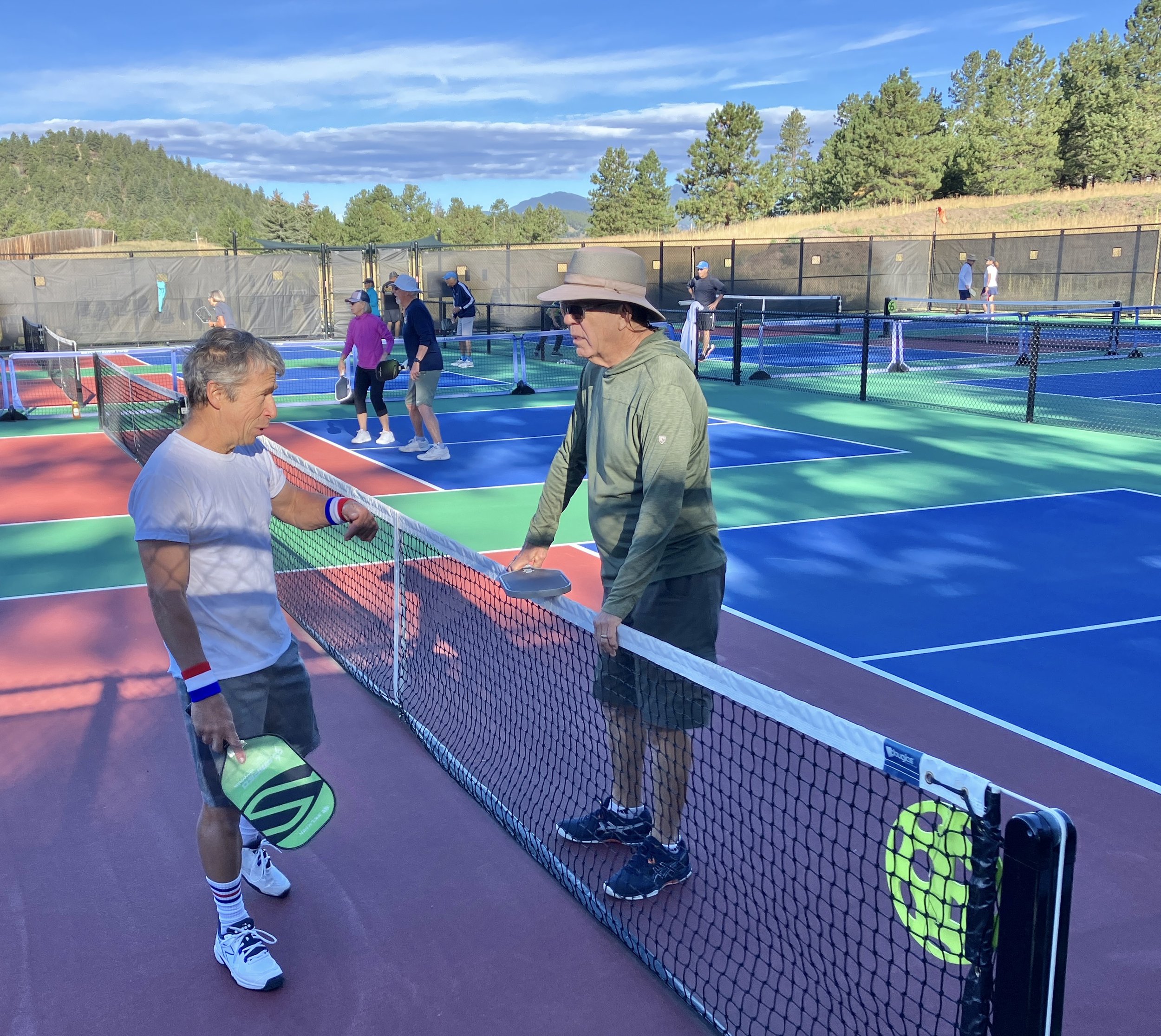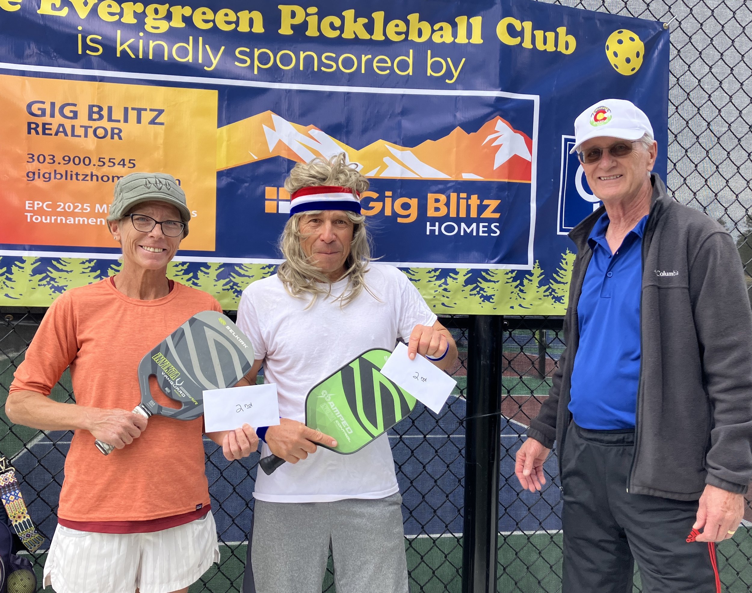 Linda Jacobsen, left, and Kathy Fasold appreciate all Mick Pearce has done for Evergreen Pickleball Club. I think his nonverbal replay was “Right back at ya.”