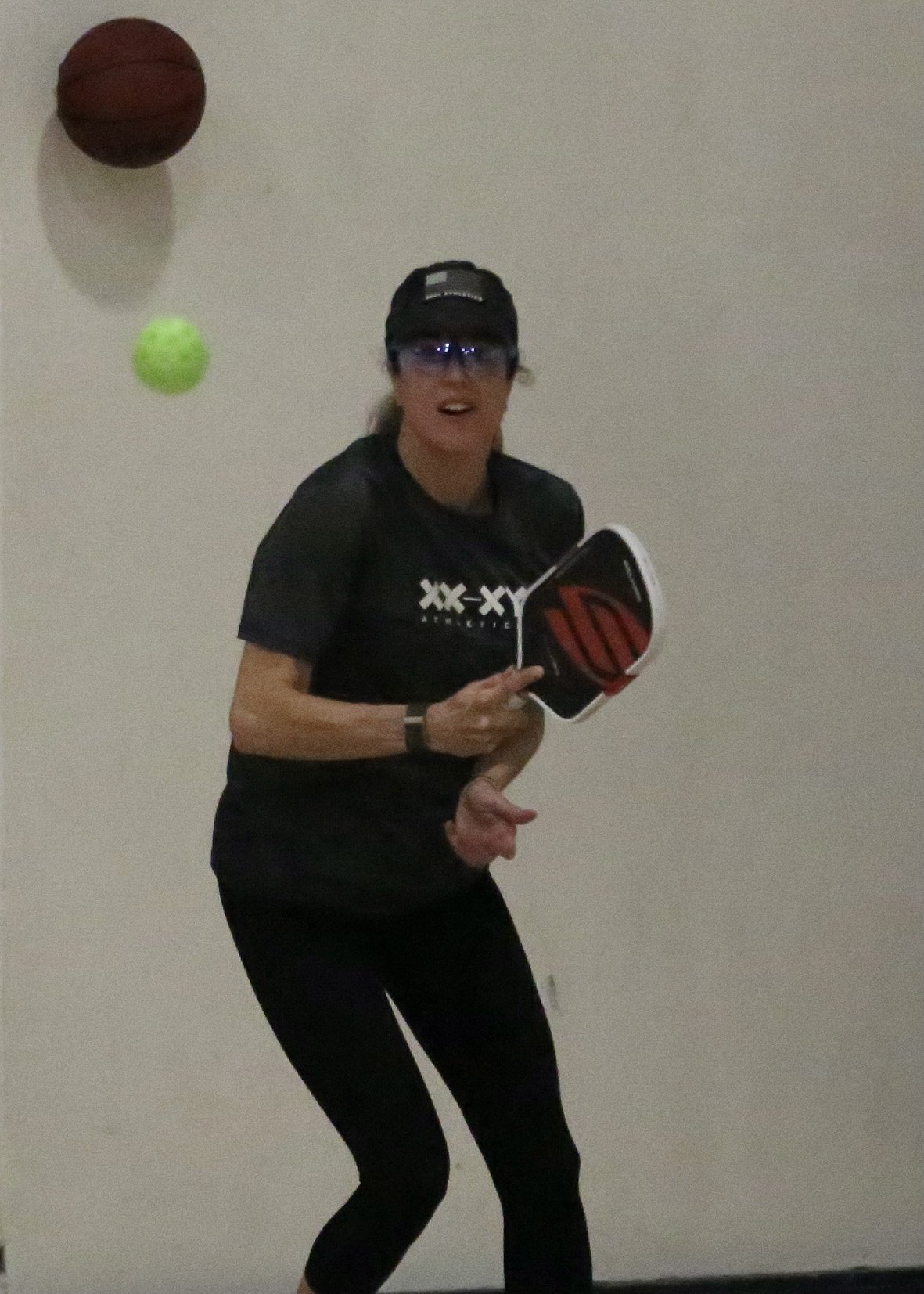 Corrine dodging a basketball while retaining concentration on the pickleball.