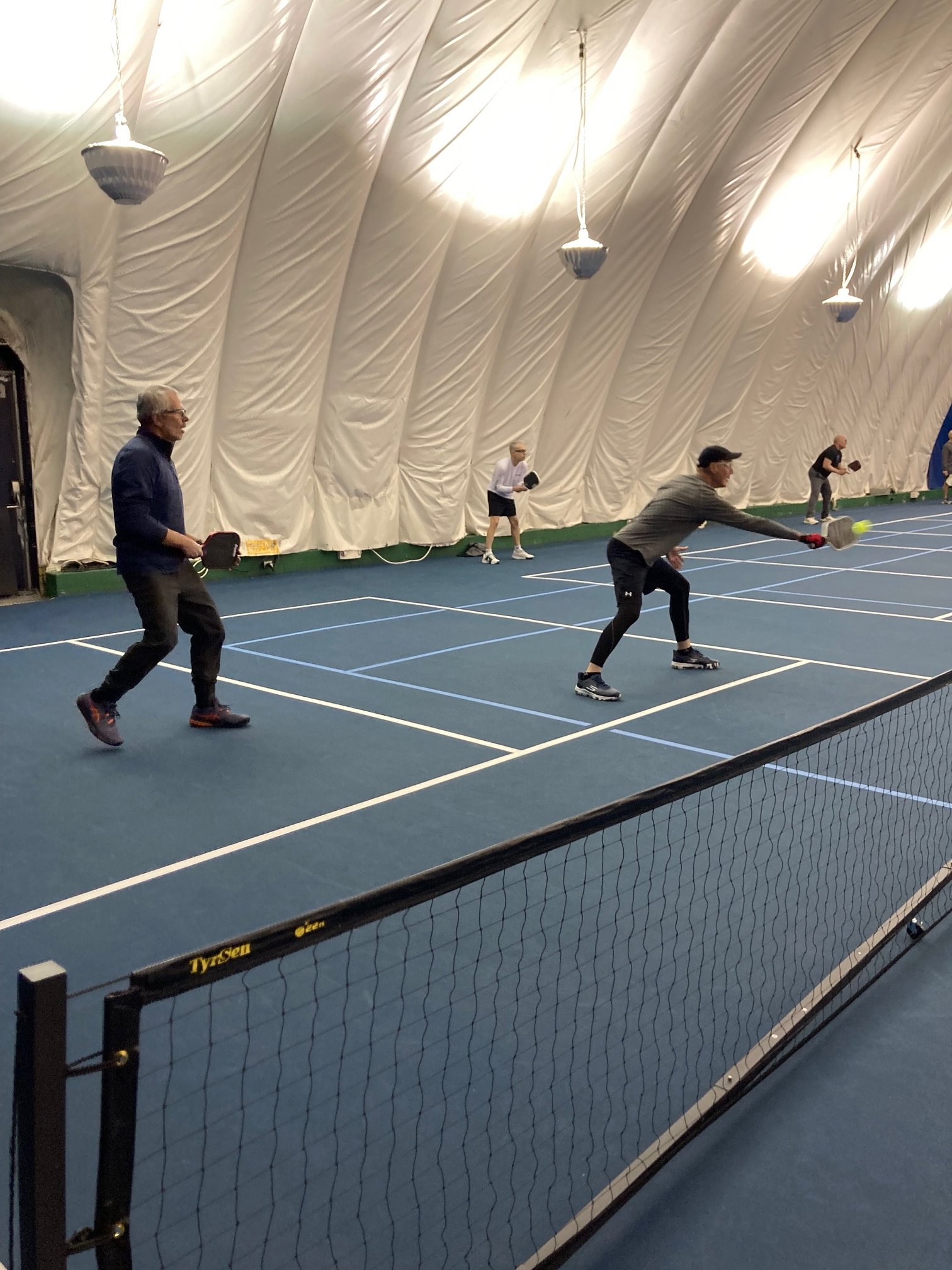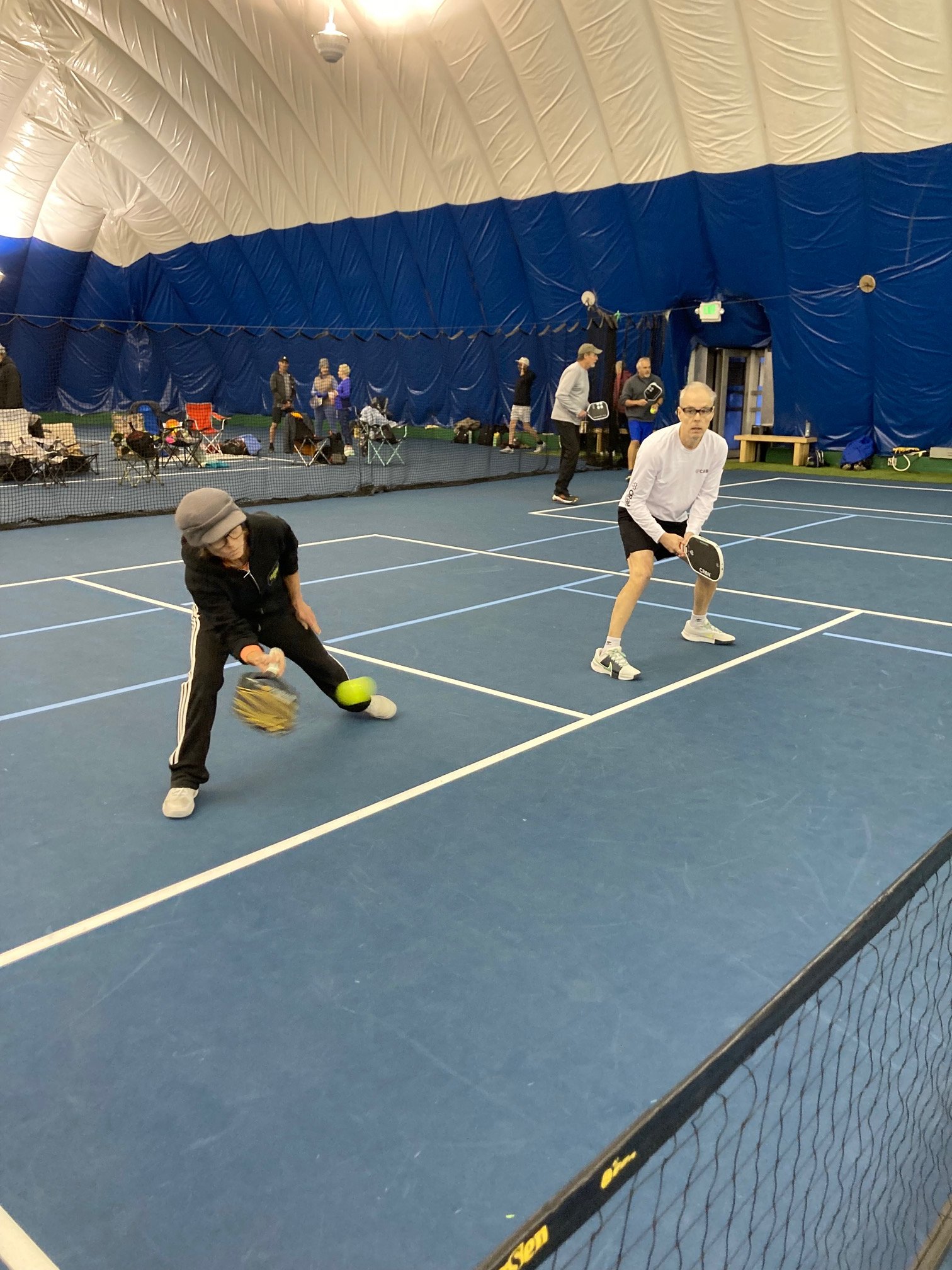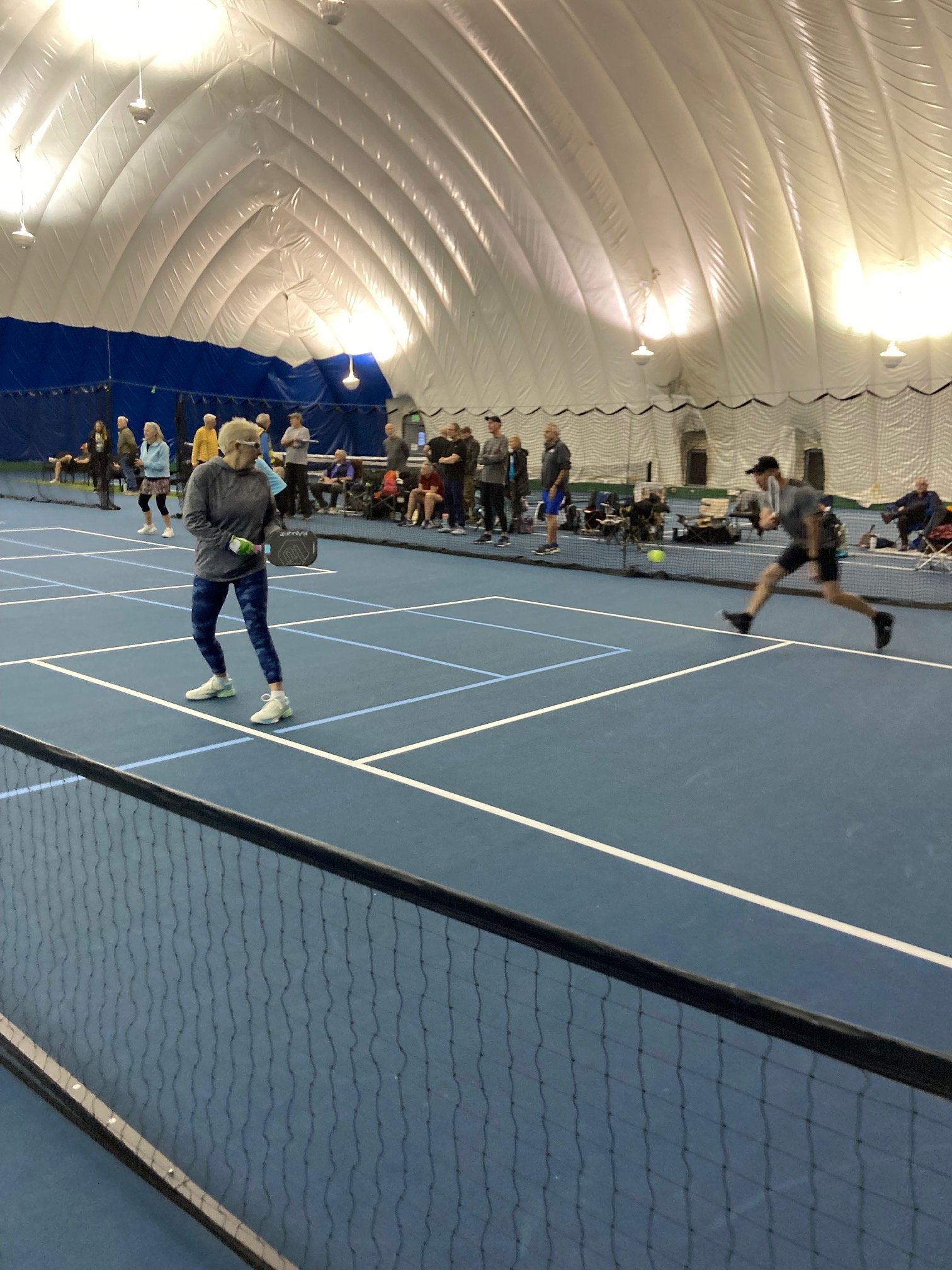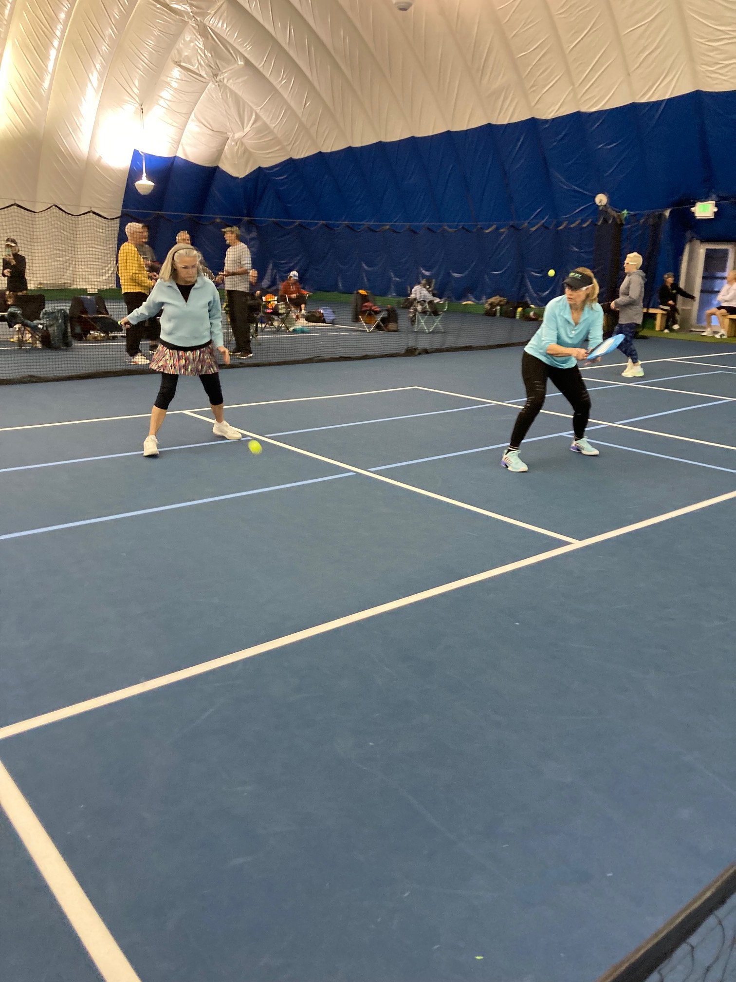 Elizabeth Barnum and Danny Hudak providing a good action shot. Diane Morton looks on in complete disgust at an out call made by her opponents.