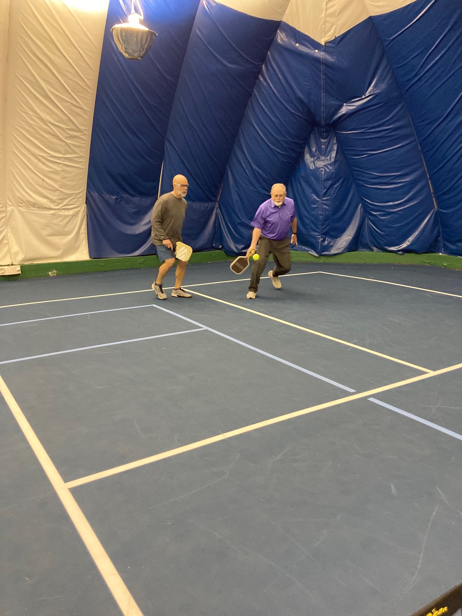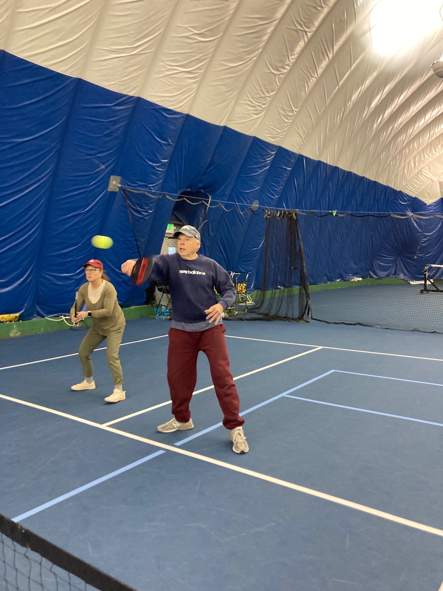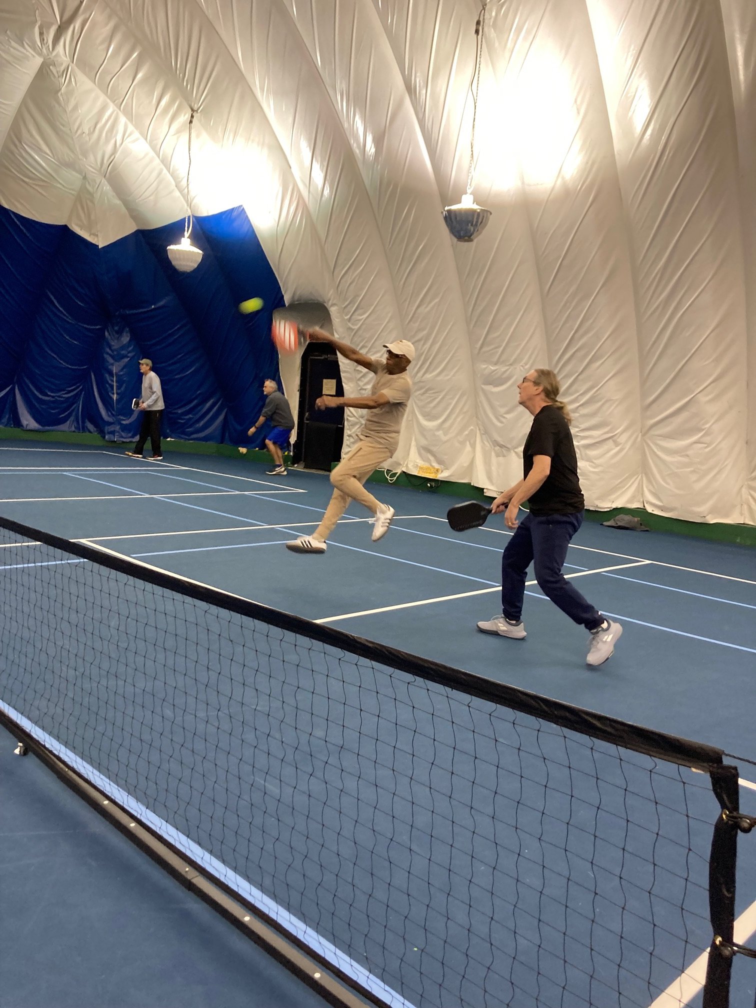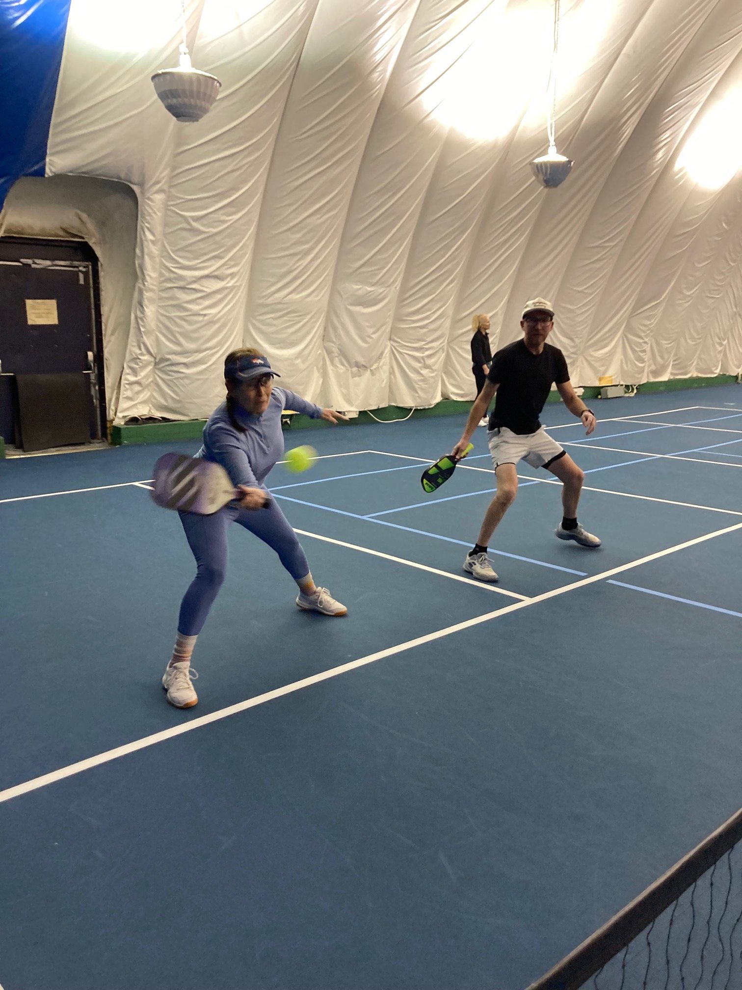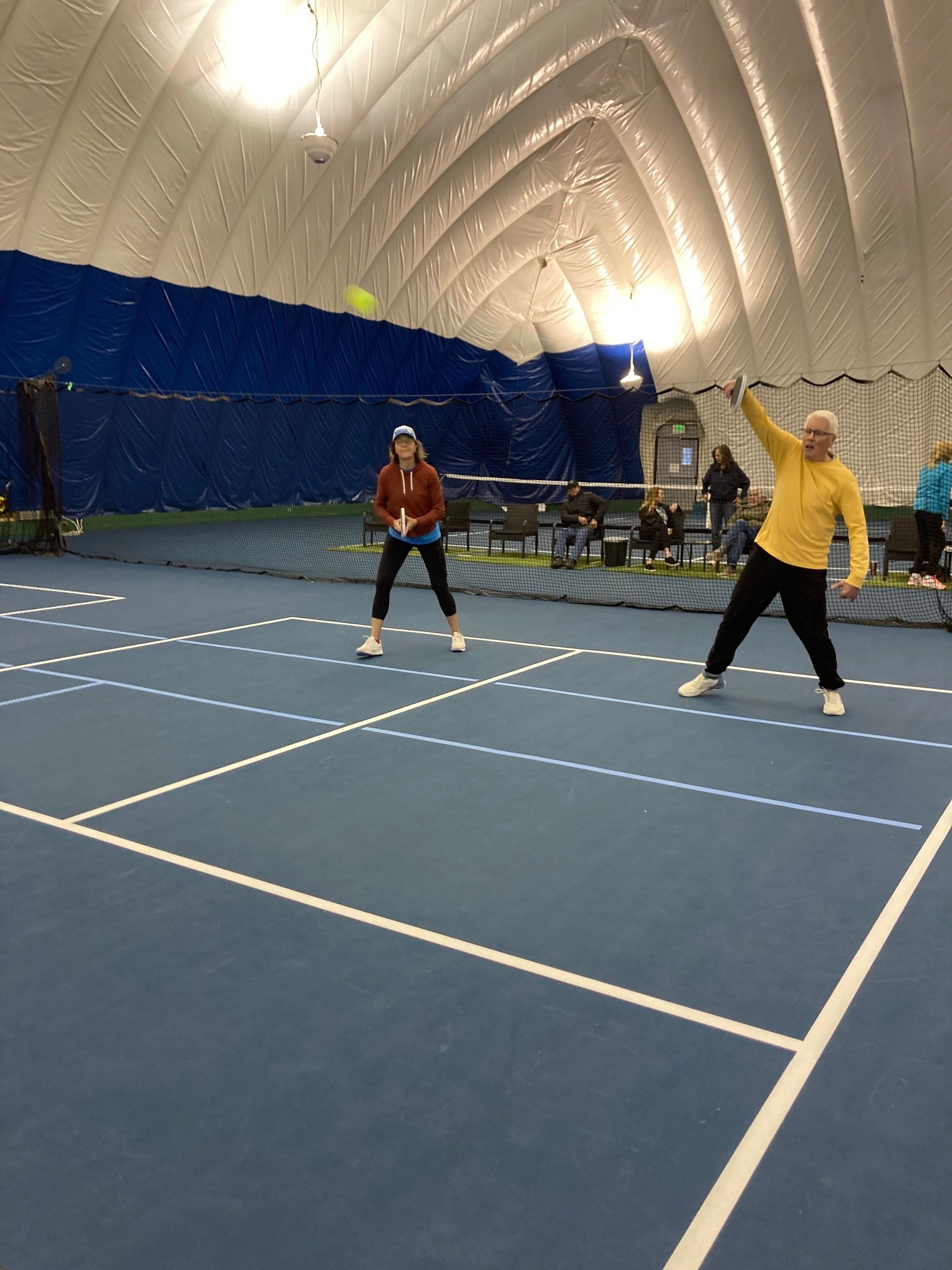 Chad Flesche smacks one back while Jennifer Nunn stays focused.