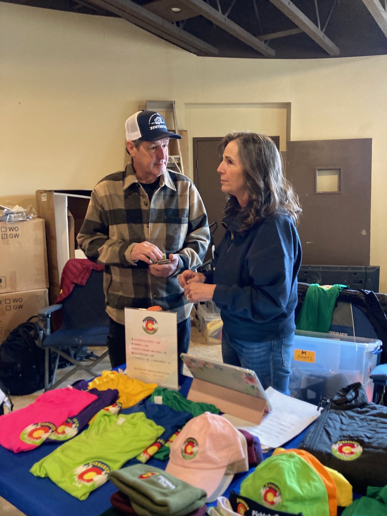 Valerie McVay and lugger-of-boxes Kirk plot how to clear out the merchandise so they don’t have to take it home.