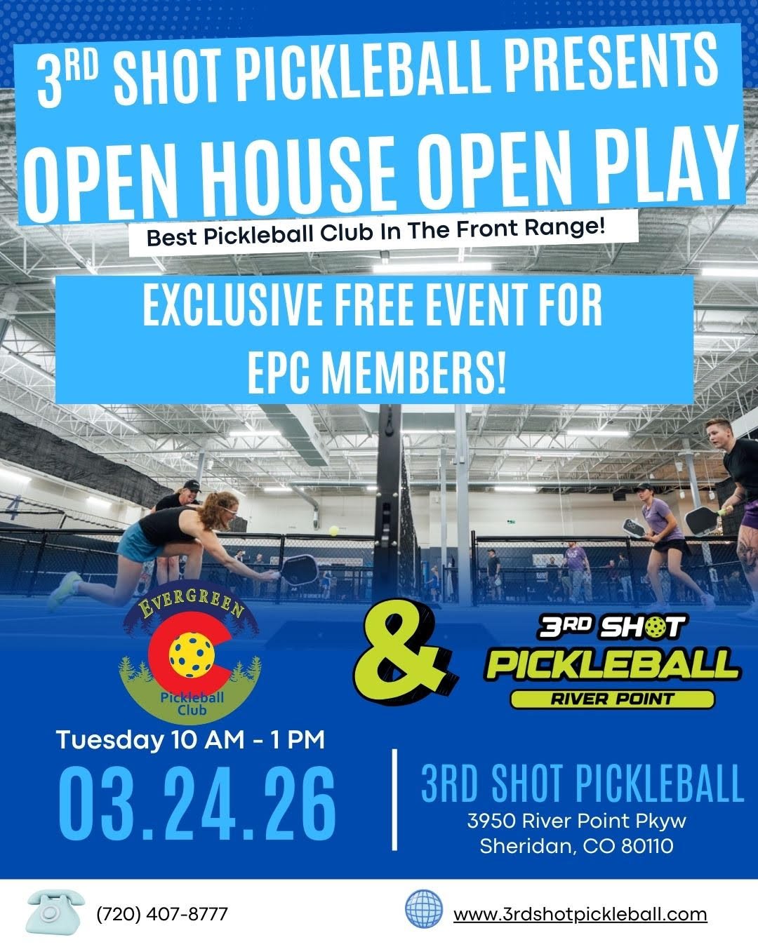 Tuesday, March 24th, 3rd Shot Drop is offering three free hours of pickleball to Evergreen pickleball players! You’ll find 3rd Shot River Point at 3950 Riverpoint Parkway in Sheridan, about a 30 minute drive.